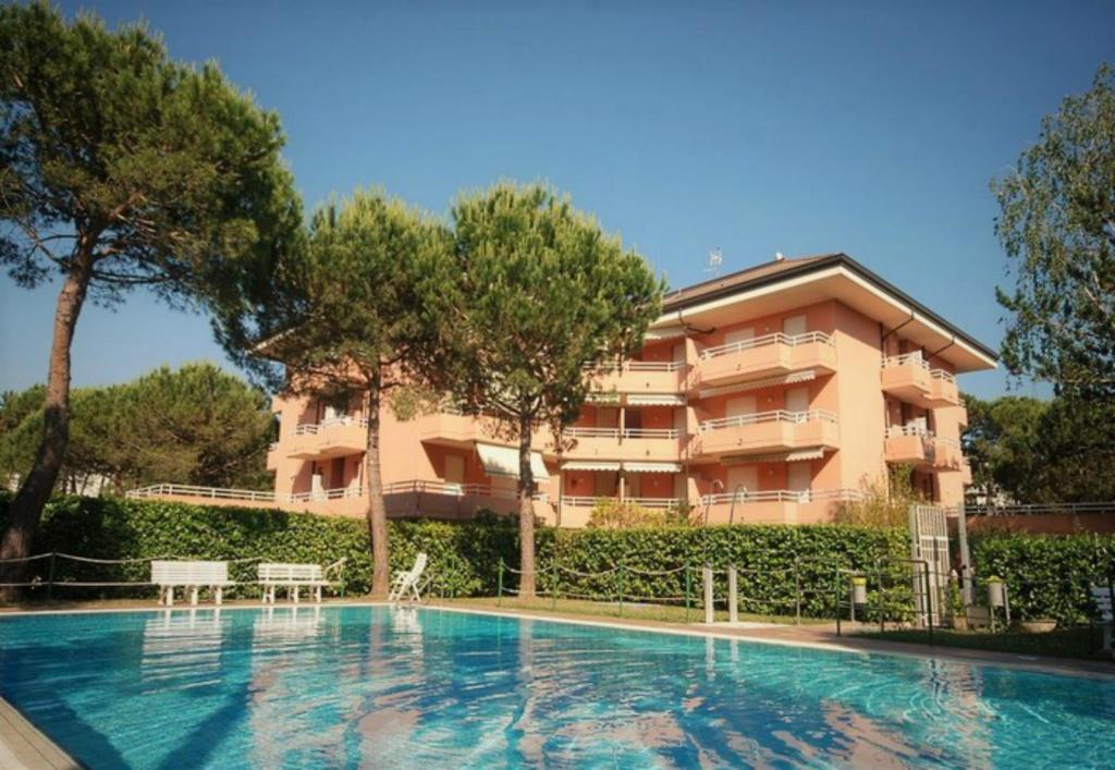Modernes Apartmenthaus in der Nähe vom Hemingway Park, in Lignano Pineta, mit Schwimmbad (ca. Anfang Juni bis Mitte September), Lift, Garten und Parkplatz, ca. 500m vom Strand entfernt.