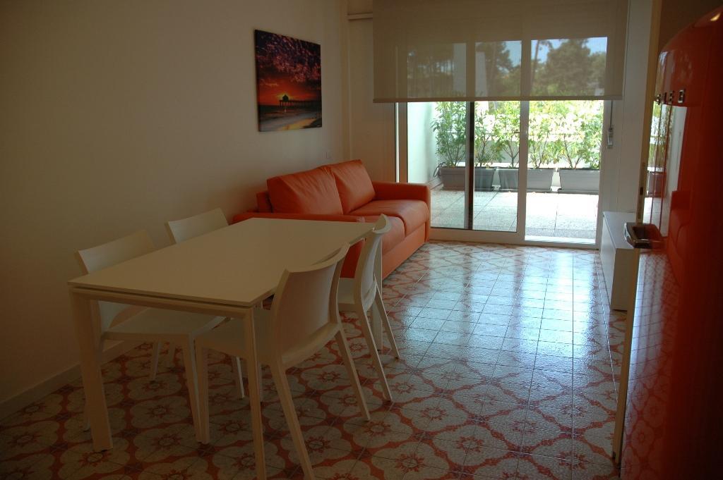 RESIDENCE ISVICO: Gemütliches Apartmenthaus in zentraler Lage, in Lignano Pineta, umgeben von Pinien, mit Parkplatz je nach Verfügbarkeit, ca. 150m vom Strand entfernt.