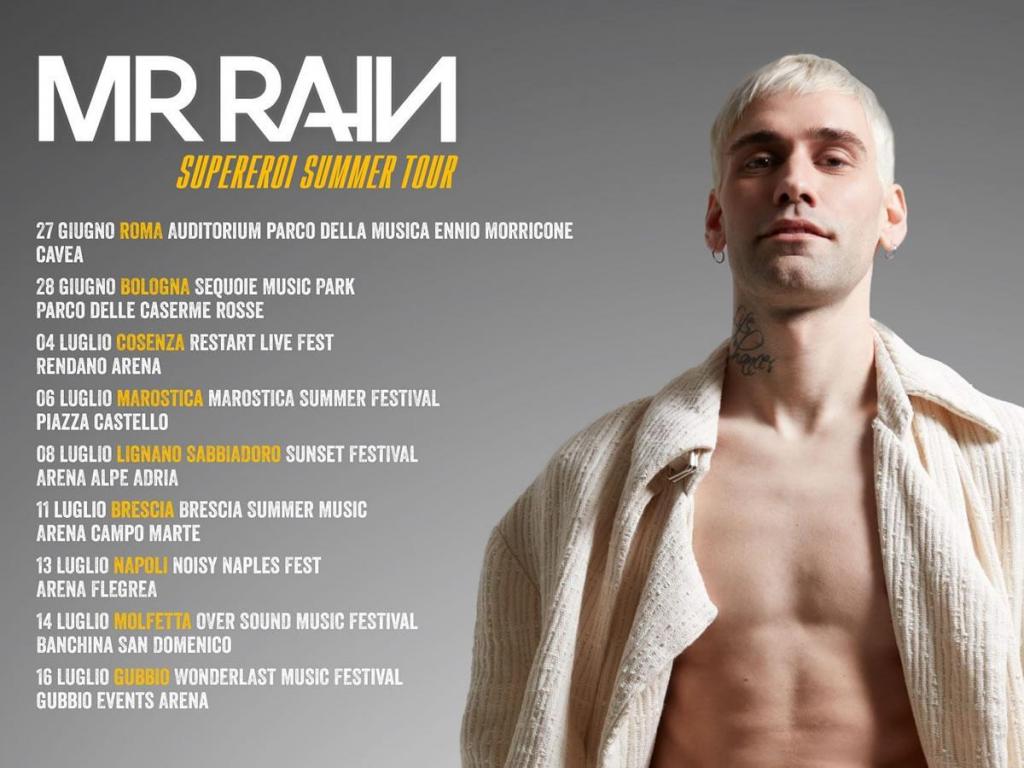Wir erwarten Sie für das großartige Mr. Rain-Konzert in Lignano Sabbiadoro! save the date, Samstag, 8. Juli 2023, 21.30 Uhr, in der Alpe Adria Arena. Nach dem großen Erfolg bei der 73. Ausgabe des Sanremo-Festivals und nachdem wir den 3. Platz erreicht haben, haben wir die Möglichkeit, einen der derzeit meistgehörten Sänger bei uns zu haben. Schon jetzt steht der mit Platin ausgezeichnete Song „Supereroi“ an der Spitze aller italienischen Radiocharts, aber auch in den Online-Charts und auf Spotify, wo er bereits 21 Millionen Streams überschritten hat. Auf der Youtube-Plattform hat es bereits 13 Millionen Aufrufe überschritten! Mr Rain und „Supereroi Summer Tour“ erwarten Sie an einem heißen Sommerabend, um gemeinsam die Meisterwerke dieses großartigen Rappers zu singen. Denken Sie daran, dass sich die Single in nur 2 Wochen nach ihrer Veröffentlichung über 100.000 Mal verkaufte und Platinstatus erreichte.
